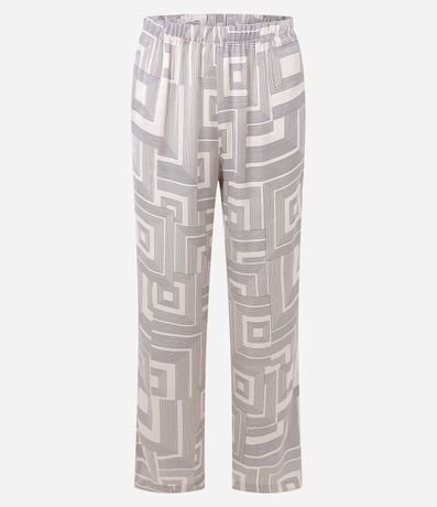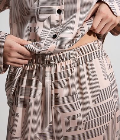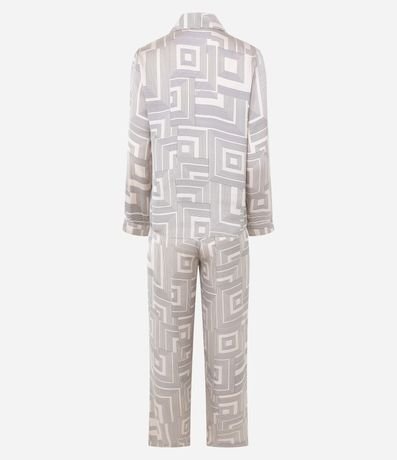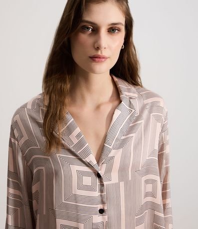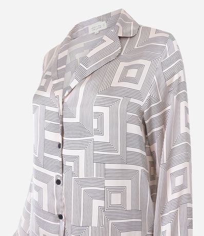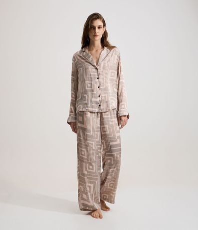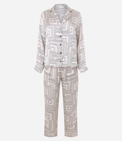 Ref: Pijama feminino confeccionado em cetim mais sustentável, no modelo americano. Composto por duas peças, blusa com gola lapela, manga longa, abotoamento frontal e calça com cós elástico. Ambos com estampa geométrica.