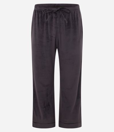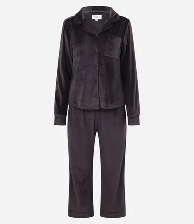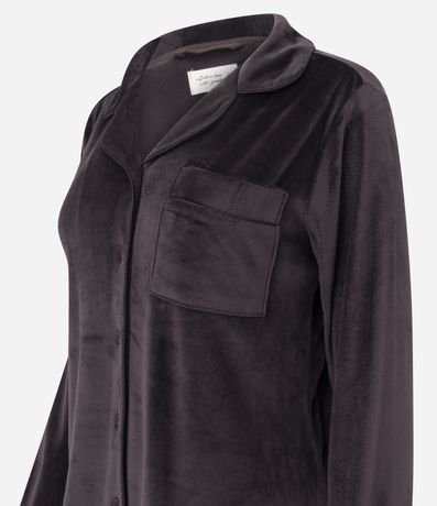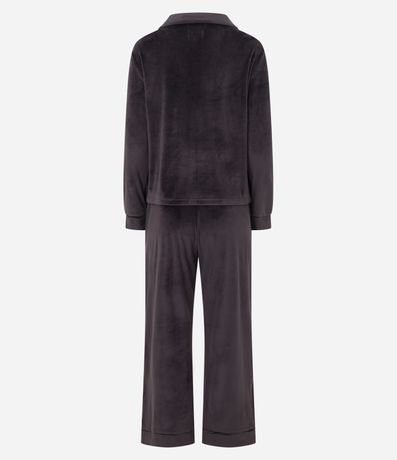Pijama feminino longo, confeccionado em plush, no modelo americano. Possui blusa com gola lapela, manga longa, abotoamento frontal e calça com cós elástico e cordão para amarração. Ambos sem estampa.