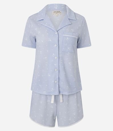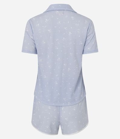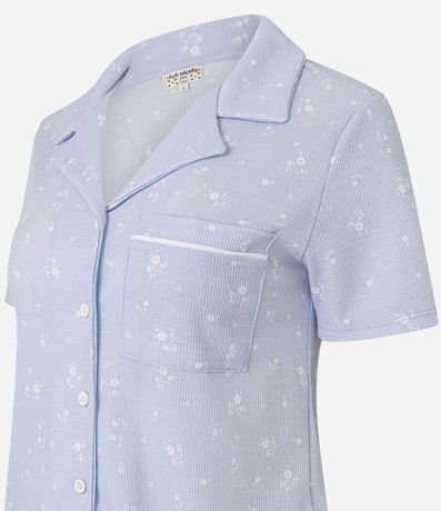 Conjunto de pijama short doll, modelo americano, confeccionado em tecido texturizado. A blusa estilo camisa tem gola lapela, botões e bolsinho no peito. O short modelo runner tem cintura elástica e amarrção. As duas peças são estampadas de mini flores.