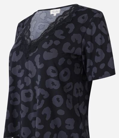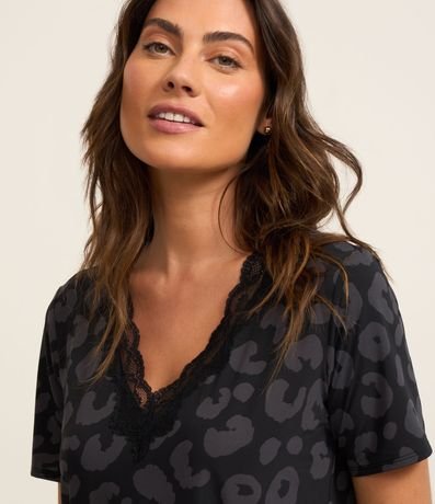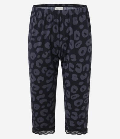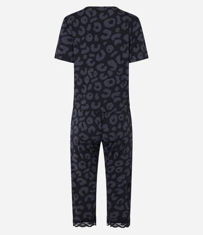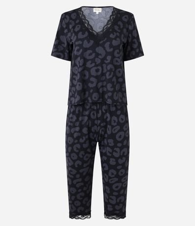 Ref: Pijama feminino, confeccionado em poliamida, com blusa manga curta e calça capri. As peças possuem detalhe de renda nas barras e estampa animal print onça.
