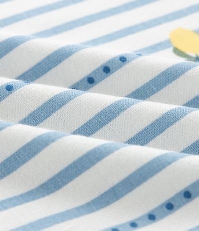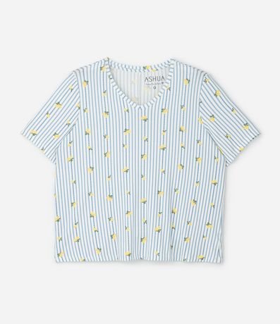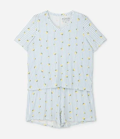 Pijama feminino confeccionado em viscolycra mais sustentável, no modelo curto. Composto por duas peças: blusa com decote v, manga curta e short com cós elástico. Ambos com estampa de limões e listrados.
