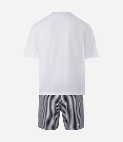Ref: Pijama masculino confeccionado em algodão certificado BCI e boas práticas ambientais. Conjunto com camiseta estampada Garfield “Mondays Suck” e shorts listrados. Ideal para noites confortáveis com estilo divertido.