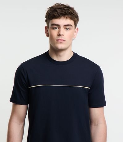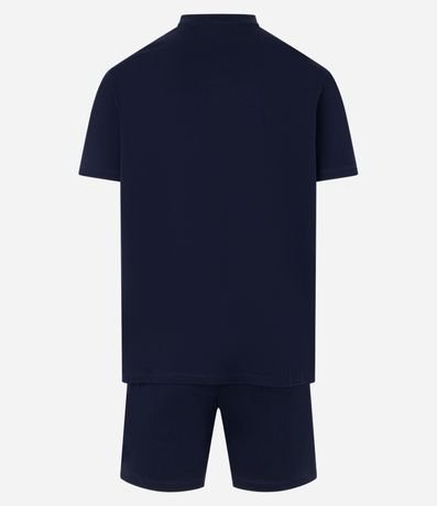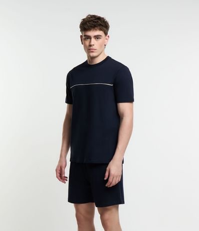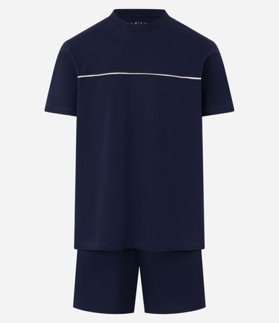 Conjunto de pijama masculino, com camiseta gola redonda, manga curta e bermuda com cós elástico e maior conforto. Peça confeccionada em algodão mais sustentável e detalhes de listra, recorte e viés aplicado.