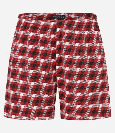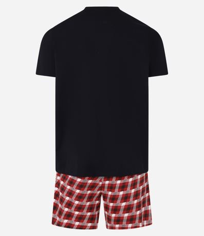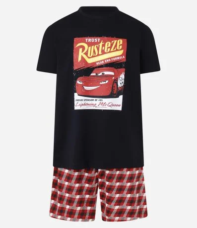Conjunto de pijama curto masculino, confeccionado em algodão mais sustentável com boas práticas ambientais, acompanha camiseta gola redonda, manga curta e estampa com o famoso carro Relâmpago Macqueen e bermuda com cós elástico estampada em xadrez.