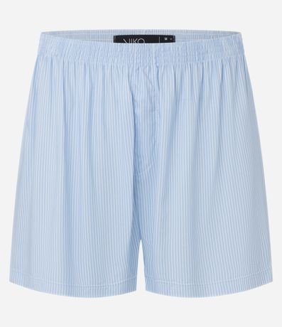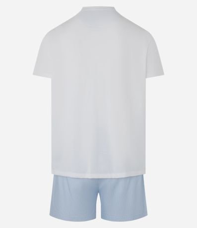 Conjunto de pijama curto masculino confeccionado com mais sustentabilidade, camiseta em manga curta, gola redonda e bolso com detalhe de listras, bermuda com cós elastico e estampa de listra fina.
