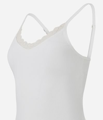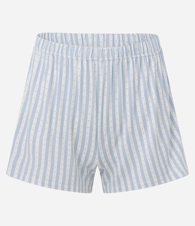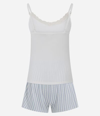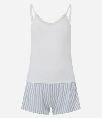 Conjunto de pijama feminino curto confeccionado em ribana, com blusa de alcinha e short de cós elástico. A blusa possui decote V com rendinha e textura canelada. O short conta com cós elástico e estampa listradinha.