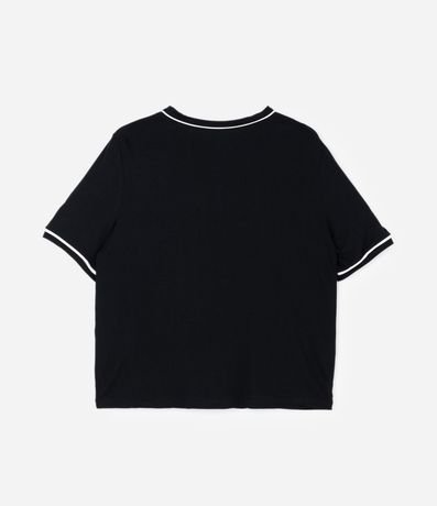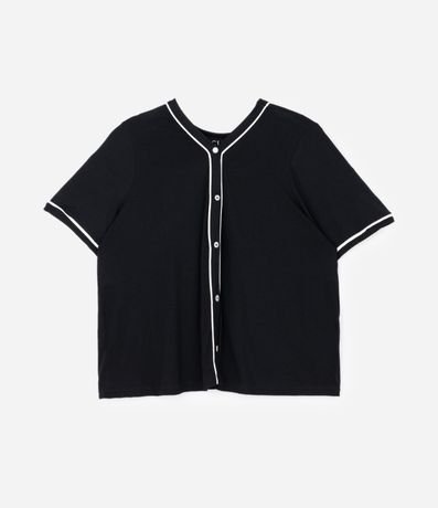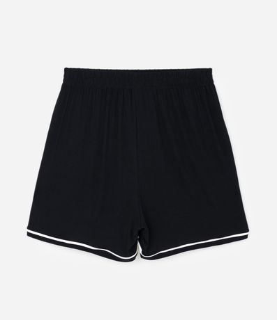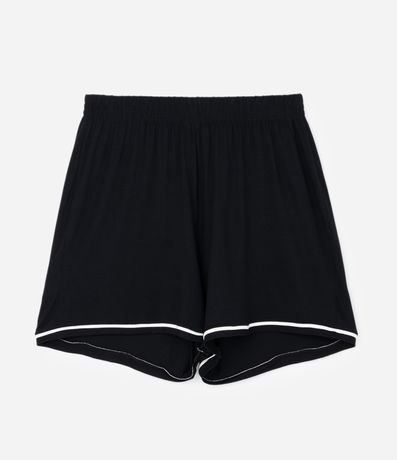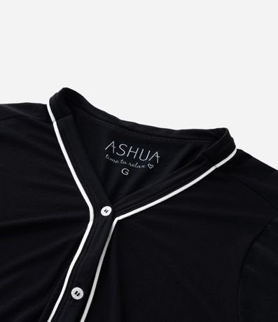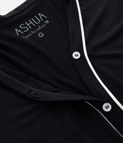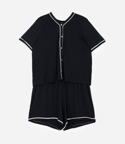 Ref: Conjunto de pijama plus size confeccionado em viscolycra sem estampa. São duas peças: blusa manga curta com gola V e abotoamento frontal; e short com cintura elástica. Tudo com detalhes de vieses contrastantes.