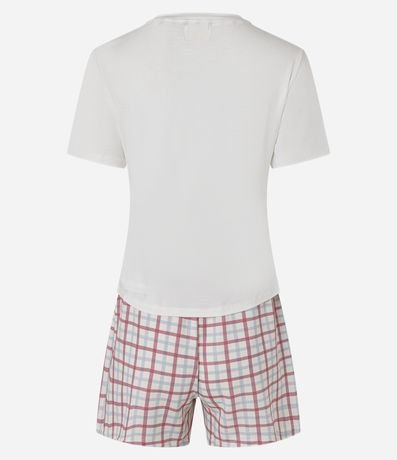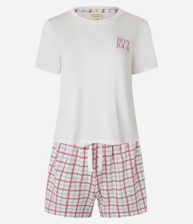 Ref: Pijama curto feminino, confeccionado em algodão, com blusa manga curta, short com amarração no cós e estampa xadrez grid.
