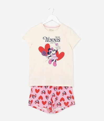 Ref: Conjunto de pijama confeccionado em algodão mais sustentável através de boas práticas ambientais, no modelo curto. São duas peças: camisetinha de manga curta, gola redonda e estampa frontal; e short com cintura elástica e estampado. Ambos com a estampa de corações e Minnie tenista.