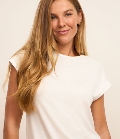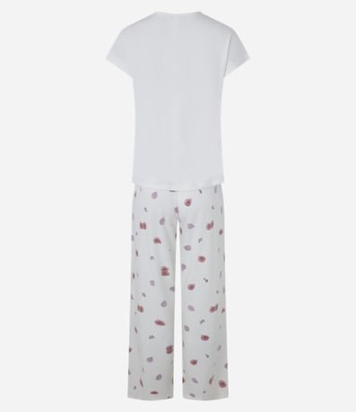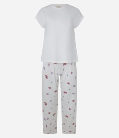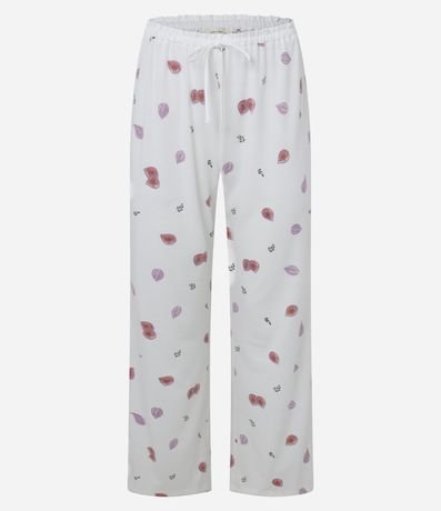 Conjunto de pijama com duas peças: blusa lisa com mangas curtas, gola redonda e detalhes de cetim; e calça com amarração e estampa de figos.