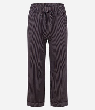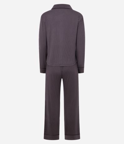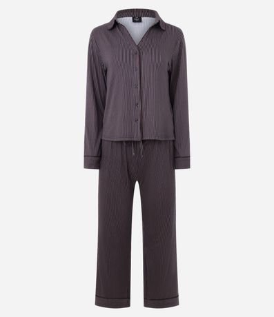 Pijama feminino adulto confeccionado em tecido com toque suave de poliéster mais sustentável, modelo americano, composto por camisa de manga longa com fechamento frontal por botões, gola clássica diferenciada e detalhe de piping contrastante, acompanhada de calça longa com padronagem listrada fullprint no mesmo acabamento, ideal para proporcionar conforto e sofisticação nos momentos de descanso.