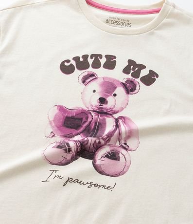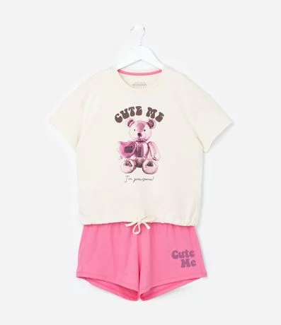 Conjunto de pijama infantil confeccionado em algodão de material mais sustentável, com  duas peças: camiseta e bermuda. Camiseta de mangas curtas, amarração na barra e short com cós elástico, o item também possui estampa de ursinho.