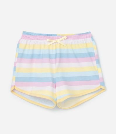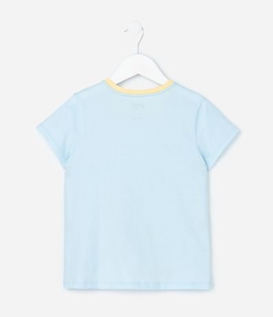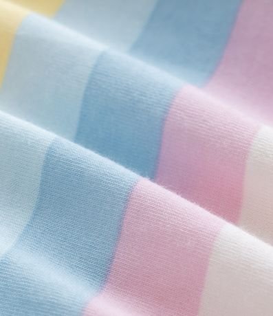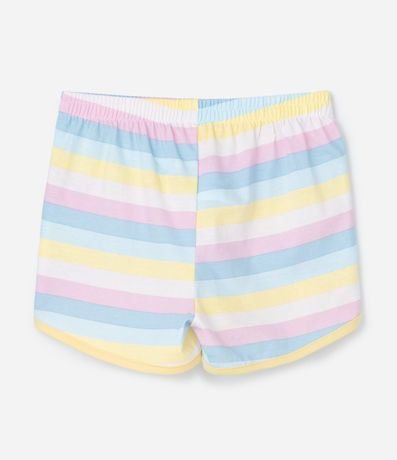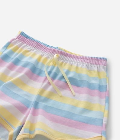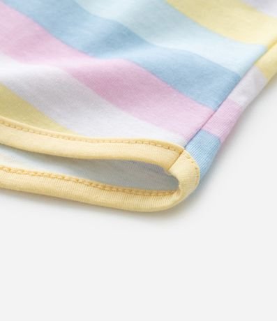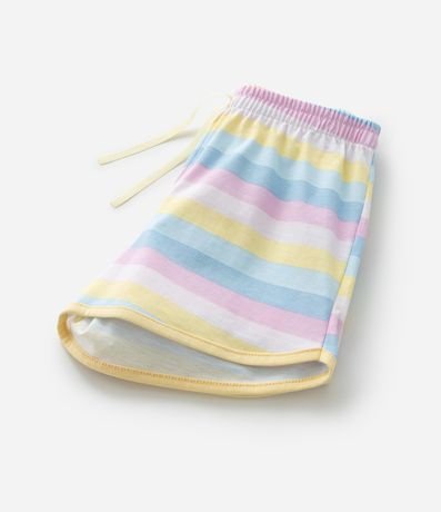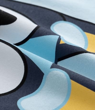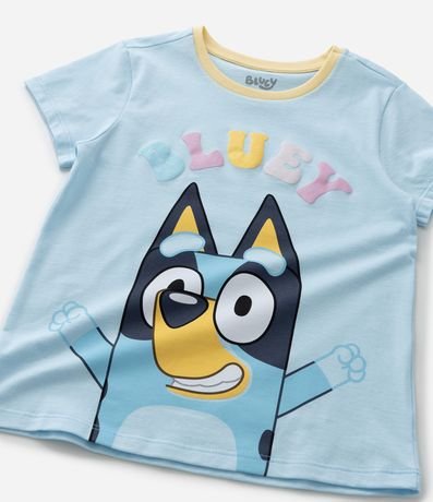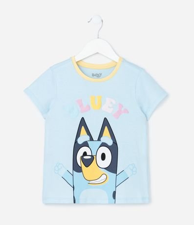 Conjunto de pijama infantil confeccionado em algodão de material mais sustentável, com  duas peças: camiseta e bermuda. De mangas curtas e com cós elástico, possui estampa do personagem Bluey com listras.