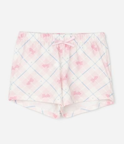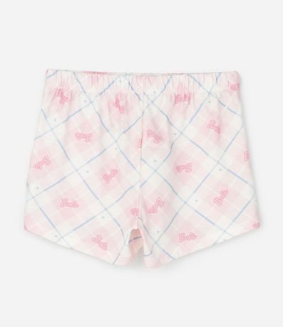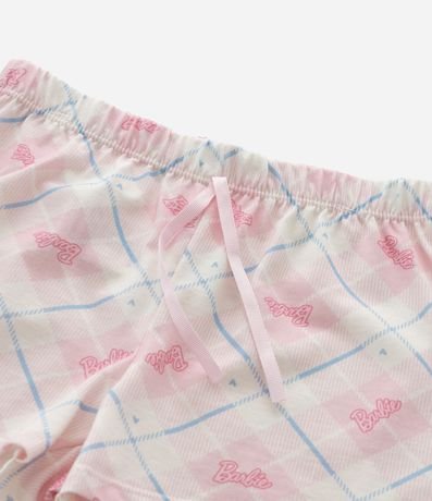 Pijama infantil confeccionado em meia malha de algodão certificado BCI, composto por blusa de manga curta com estampa localizada da Barbie, ícone clássico da cultura pop. Acompanha short com cós elástico, estampa xadrez e padronagem Barbie aplicada por toda a superfície.