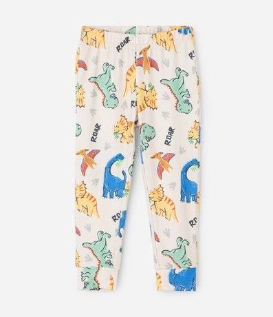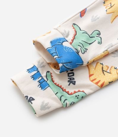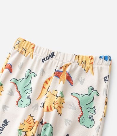 Pijama infantil confeccionado em tricô leve com estampa divertida de dinossauros por toda a superfície. A blusa possui gola redonda, mangas longas e acabamentos macios, enquanto a calça conta com cós elástico para maior conforto na rotina noturna.