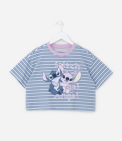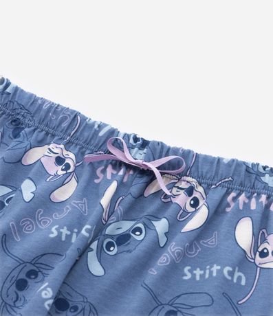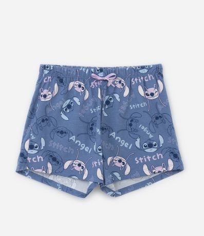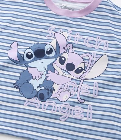 Conjunto de pijama infantil curto, confeccionado em malha de algodão mais responsável e composto por 02 peças: Camiseta e shortinho. A camiseta possui modelo semi cropped, com gola redonda, mangas curtas e estampa do Stitch e Angel em fundo listrado. A bermudinha conta com cós elástico, amarração na cintura e estampa dos personagens em repetição.