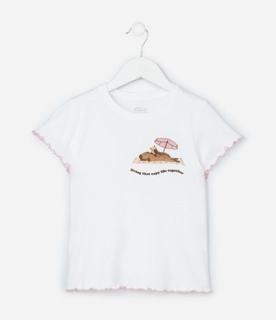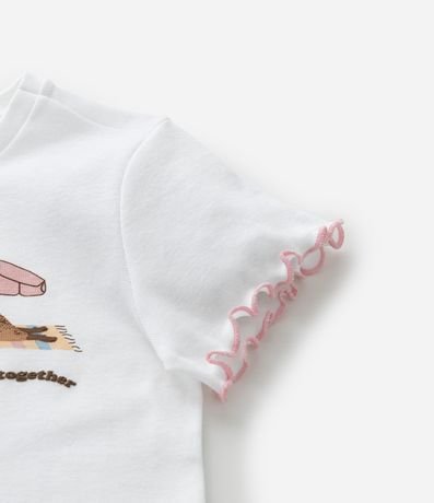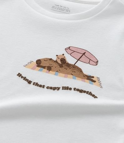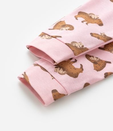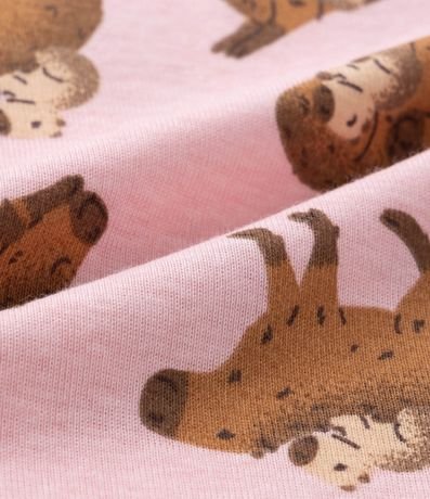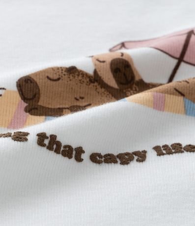 Ref: Conjunto de pijama infantil confeccionado com algodão mais sustentável: uma blusa manga curta com frufru nas bordas e uma calça com cós elástico e estampa de capivaras.