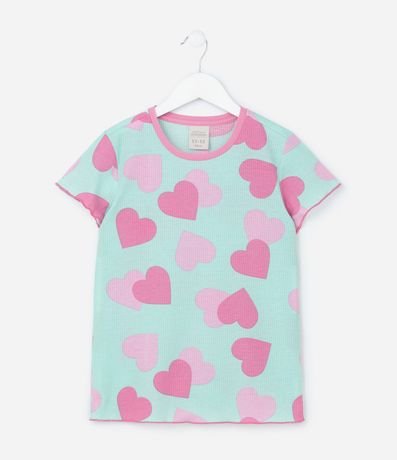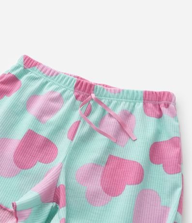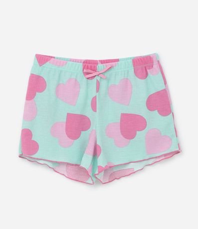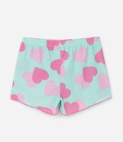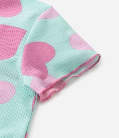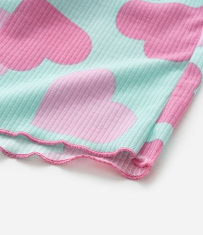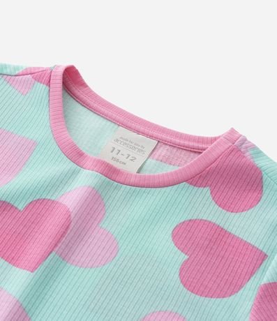 Ref: Conjunto de pijama infantil confeccionado em ribana, feito com processo mais sustentável, com duas peças: camiseta e short. De mangas curtas e com cós elástico, possui frufru nas bordas e estampa de corações.