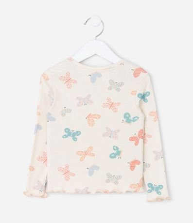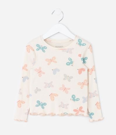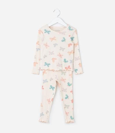 Ref: Pijama infantil confeccionado em ribana macia, com estampa fullprint de borboletas que adiciona delicadeza ao visual. A blusa traz acabamentos ondulados, enquanto a calça possui cós elástico e laço frontal. Confeccionado em algodão certificado BCI.