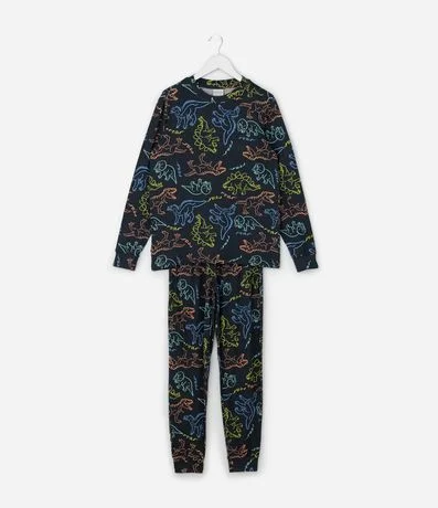 Ref: Conjunto de pijama infantil longo em plush com toque peach touch. Blusa com gola redonda e mangas longas, calça com cós elástico e caimento confortável. Estampa fullprint de dinossauros em traços gráficos, perfeita para noites aconchegantes e descanso diário.