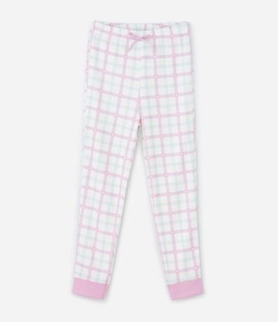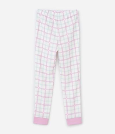 Pijama infantil confeccionado em algodão certificado BCI e boas práticas ambientais, composto por blusa de manga longa com personagens Stitch e Angel e calça xadrez macia.