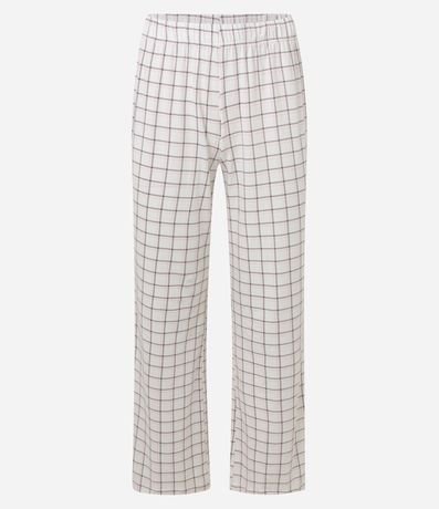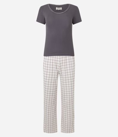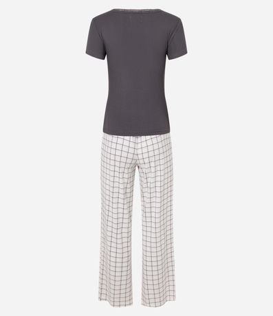 Ref: Pijama feminino longo com blusa de gola redonda, manga curta e canelada acompanhada de calça longa com cós elástico, em peach touch com estampa xadrez.