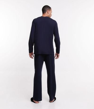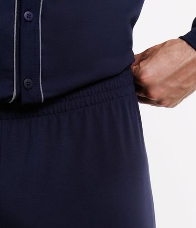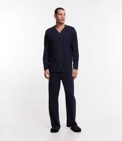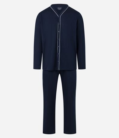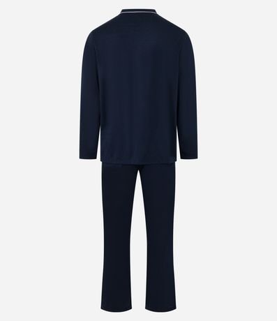 Conjunto de pijama alongado confeccionado em meia malha com camisa de mangas longas com listras contrastantes no abotoamento frontal e calça com elástico no cós.