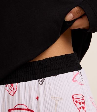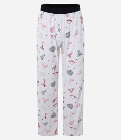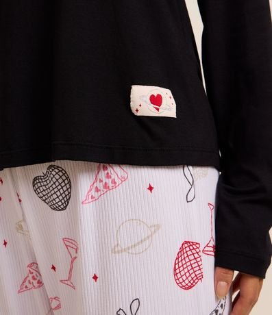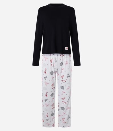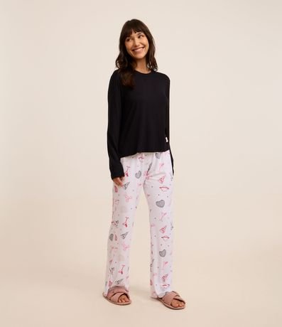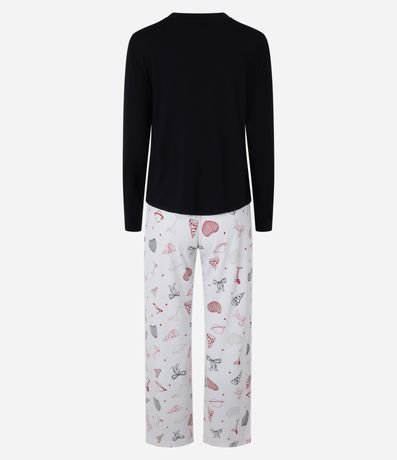 Ref: Pijama longo feminino, confeccionado com processo mais sustentável, com blusa manga longa sem estampa e calça com cós elástico e estampa de ícones variados.