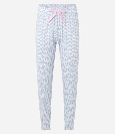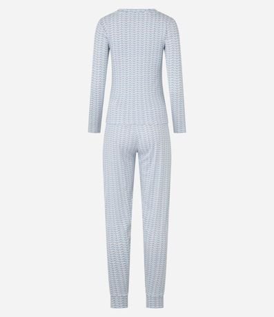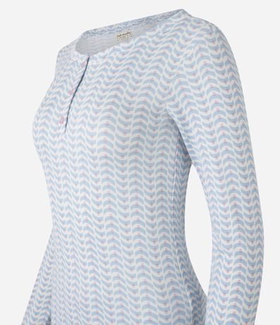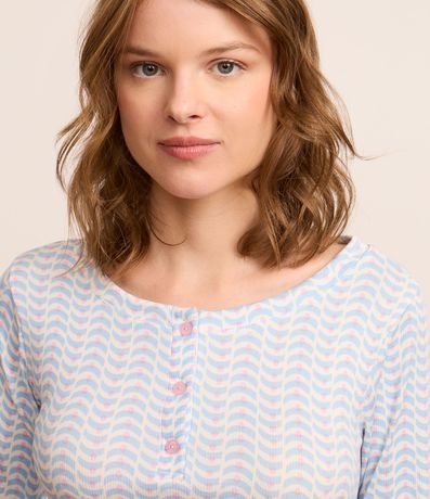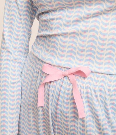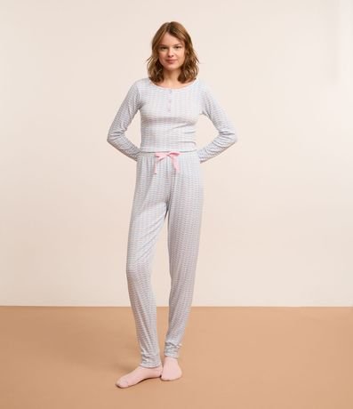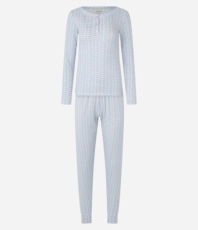 Ref: Conjunto de pijama longo confeccionado em malha. São duas peças: blusa manga longa com botões no peitilho; e calça com cintura elástica, amarração e punhos ajustados. Tudo estampado de ícones em repetição.