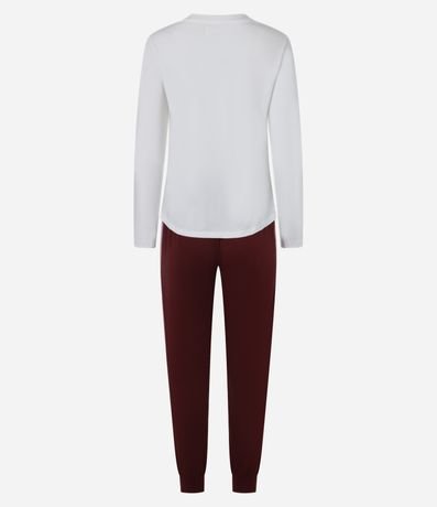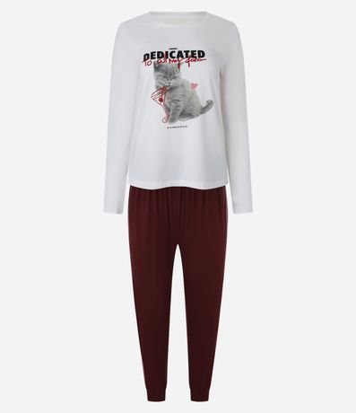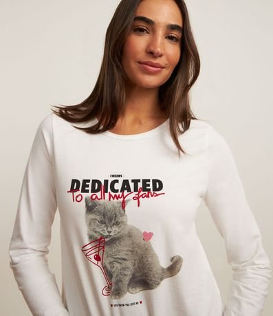 Ref: Conjunto de pijama longo com duas peças: blusa em malha de algodão com mangas longas e estampa de gatinho "dedicated to all my fans" (dedicado a todos os meus fãs); e calça em malha de viscose com cintura elástica e punhos ajustados.