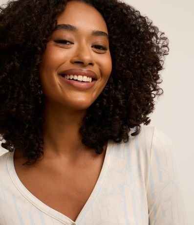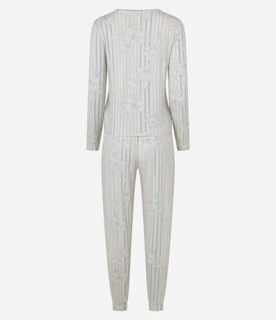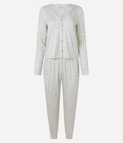 Conjunto de pijama feminino com duas peças longas confeccionadas em malha de toque suave. A blusa tem decote V e abotoamento; e a calça tem cintura elástica e punhos ajustados. As duas peças são estampadas de listras e flores.