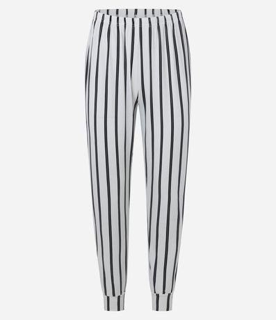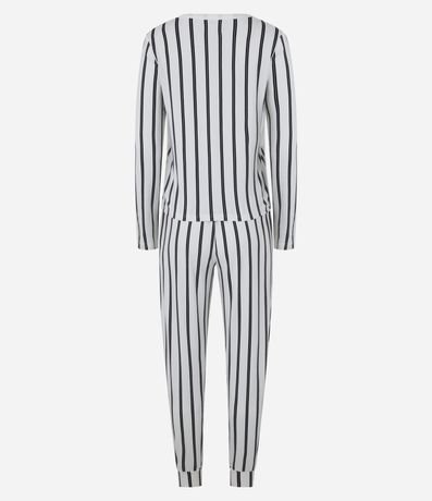 Ref: Conjunto de pijama longo confeccionado em peach touch. São duas peças: blusa manga comprida com gola V e abotoamento frontal; e calça com cintura elástica e punhos ajustados. Tudo estampado com listras verticais.