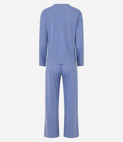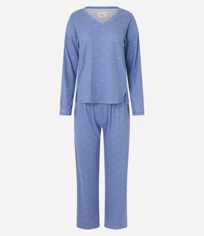 Ref: Pijama longo feminino, confeccionado em ribana, com blusa manga longa, decote V, calças com cós elástico e estampa poá.