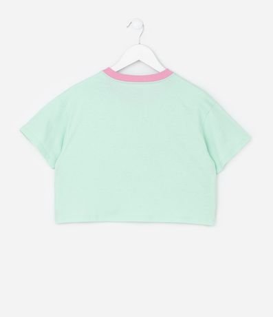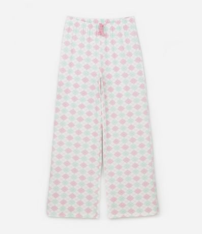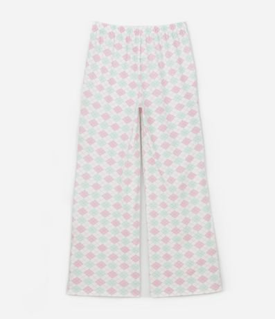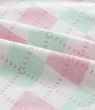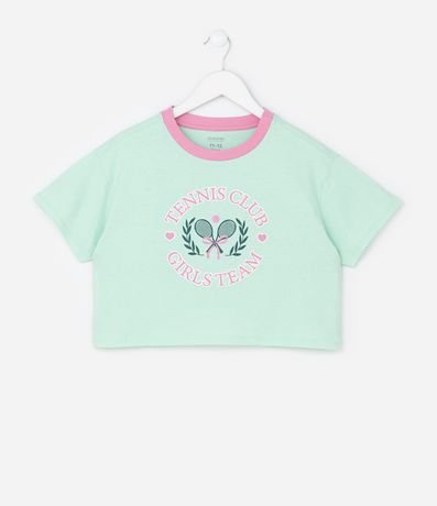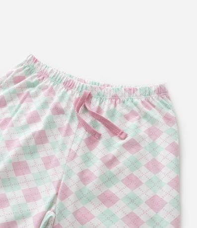 Conjunto de pijama infantil confeccionado em algodão mais sustentável através de boas práticas ambientais, com duas peças: camiseta com gola redonda, mangas curtas, modelo cropped e estampada Tennis Club e calça com cós elástico, com cordão e estampa xadrez.