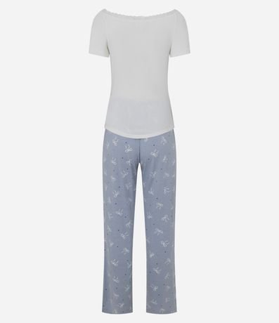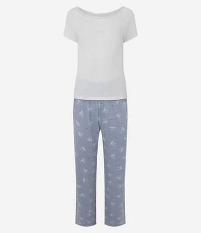 Ref: Pijama confeccionado em ribana de viscose mais sustentável, com toque macio, elasticidade e conforto para o uso diário. O conjunto é composto por blusa de manga curta com gola canoa, que recebe detalhe em renda no decote, acrescentando acabamento delicado ao visual. A peça conta ainda com ícone em strass localizado no peito, trazendo brilho sutil. A calça longa possui estampa de ícones em repetição, modelagem regular e cós com elástico, garantindo ajuste confortável. Ideal para momentos de descanso com leveza e praticidade.