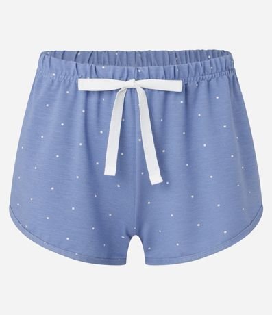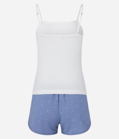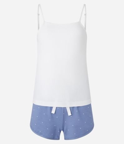 Ref: Conjunto fresquinho de pijama com duas peças confeccionadas com viscose certificada. A blusa regata é canelada e lisa. O short estilo runner é estampado de bolinhas.