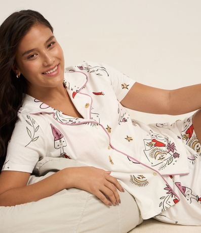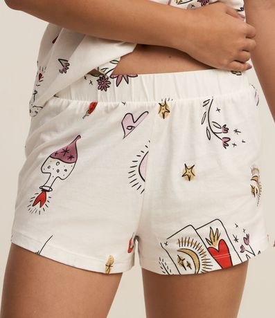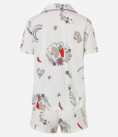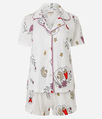 Conjunto de pijama americano curto confeccionado em algodão BCI. São duas peças: blusa manga curta com gola lapela e abotoamento frontal; e short com cintura elástica. Tudo estampado de ícones místicos, como cartas, corações e lua.