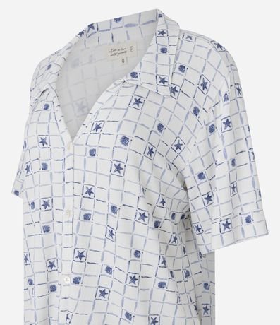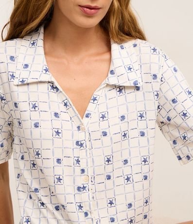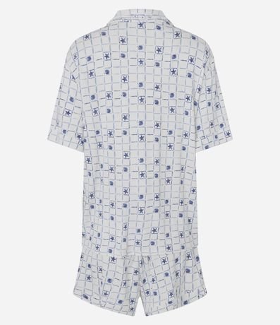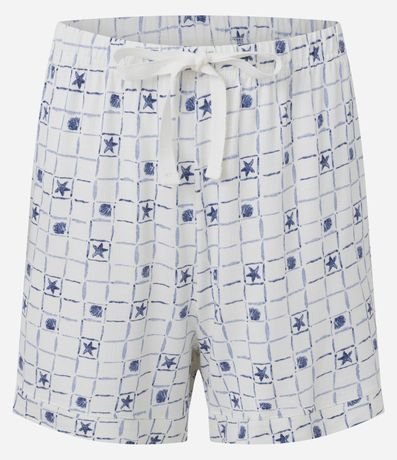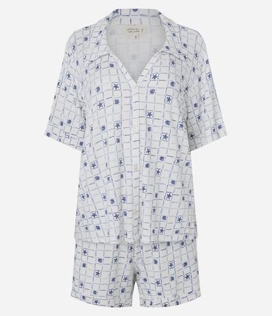 Ref: Conjunto de pijama americano curto confeccionado em viscolycra. São duas peças: blusa manga curta com gola lapela e abotoamento frontal; e short com cintura elástica e amarração. Tudo estampado de conchinhas e estrelas do mar.