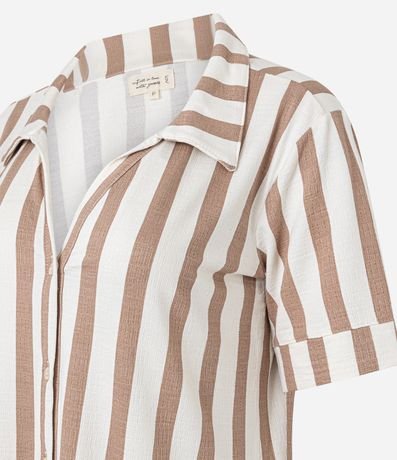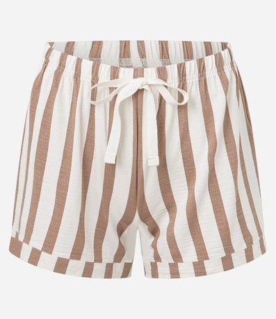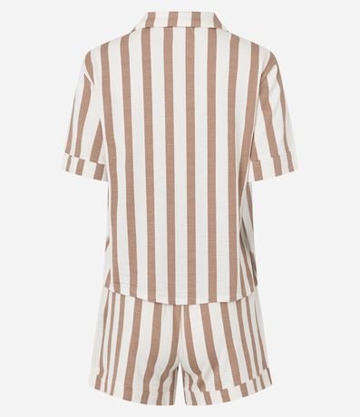 Conjunto de pijama americano confeccionado em viscolycra. São duas peças: blusa manga curta com abotoamento frontal; e short com cintura elástica e amarração. Tudo estampado de listras verticais.