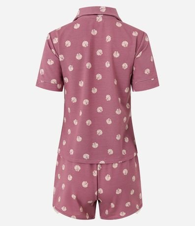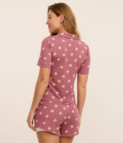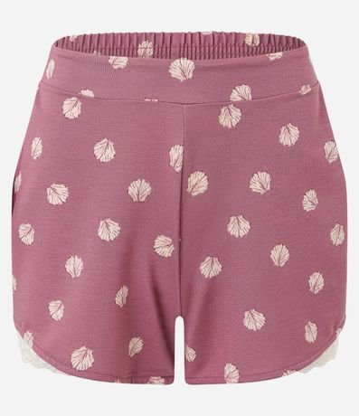 Ref: Conjunto de pijama americano confeccionado em viscose certificada. São duas peças: blusa manga curta com gola lapela e abotoamento frontal; e short com cintura elástica e rendinha na barra. Tudo estampado de conchas.