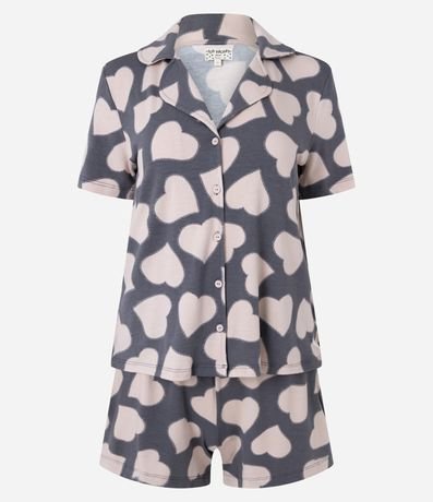 Ref: Conjunto de pijama americano confeccionado em viscose certificada. São duas peças: blusa manga curta com gola lapela e abotoamento frontal; e short com cintura elástica e amarração. Tudo estampado de corações.