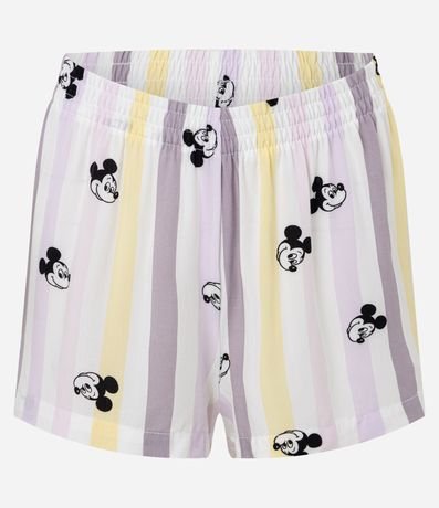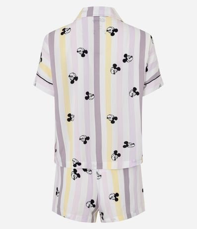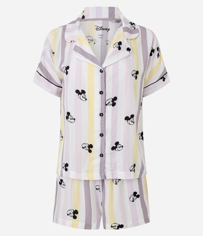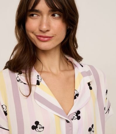 Ref: Conjunto de pijama americano confeccionado em viscose. São duas peças: blusa manga curta com gola lapela e abotoamento frontal; e short com cintura elástica. Tudo estampado de listras e Mickey.