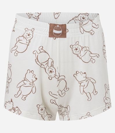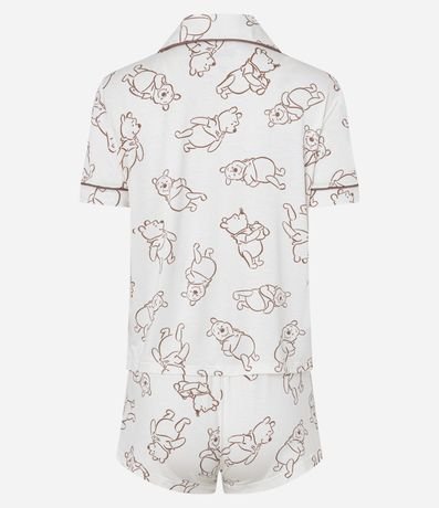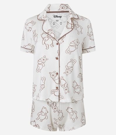 Ref: Conjunto de pijama americano confeccionado em viscose. São duas peças: blusa manga curta com gola lapela e abotoamento frontal; e short com cintura elástica. Tudo estampado de contorno do Ursinho Pooh.