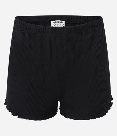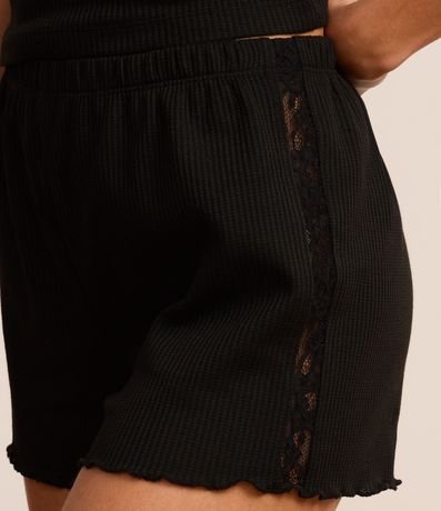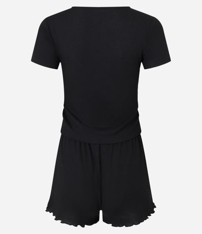 Ref: Conjunto de pijama curto de malha. São duas peças: camiseta manga curta com gola V e aplicação de renda cruzada; e short com cintura elástica e barra frufru.