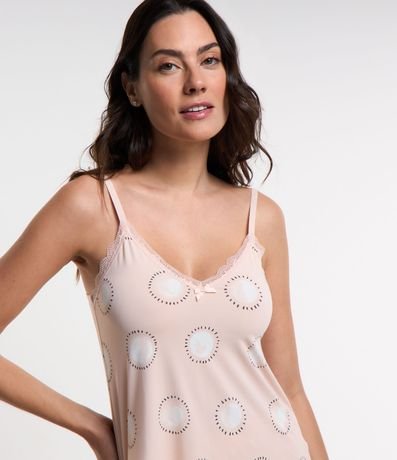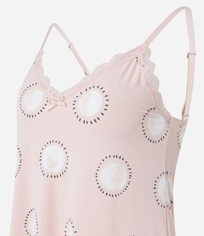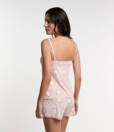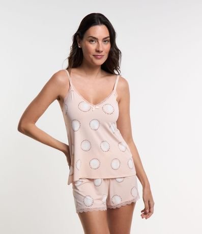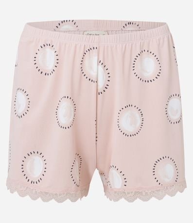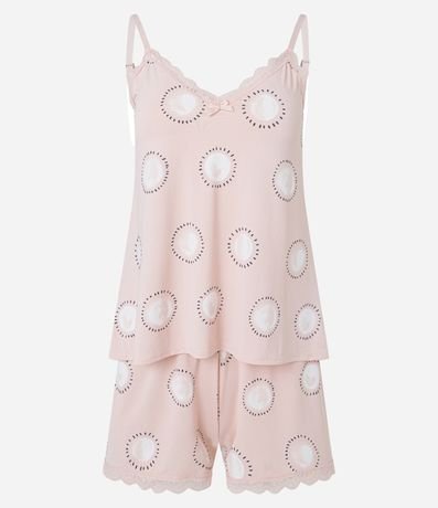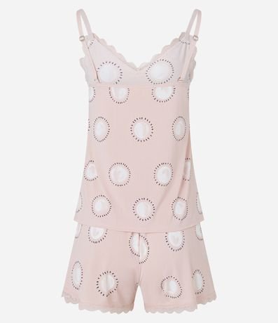 Ref: Pijama Short Doll com estampa de circulos com detalhes em renda na gola e short.