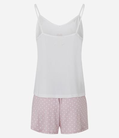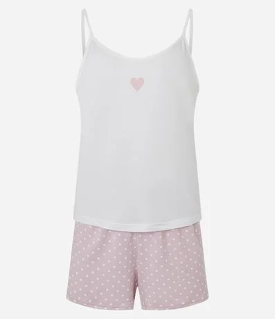 Ref: Conjunto de pijama fresquinho confeccionado em malha macia. São duas peças: blusa com alcinhas fixas (sem regularem) e estampa localizada de coração; e short poá com cintura elástica.