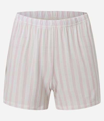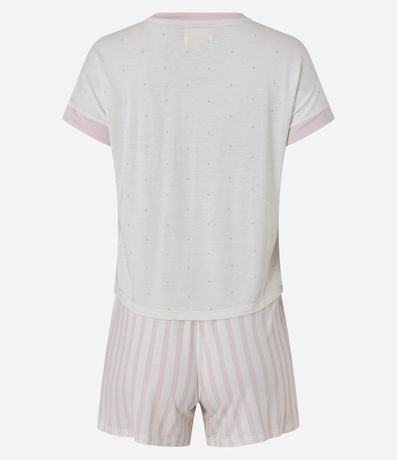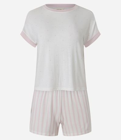 Ref: Pijaminha feminino de modelo short doll, composto de blusa e short. Possui blusa de gola redonda, manga curta e estampa poá, já o shortinho possui estampa listrada. Item confeccionado em viscose mais sustentável.