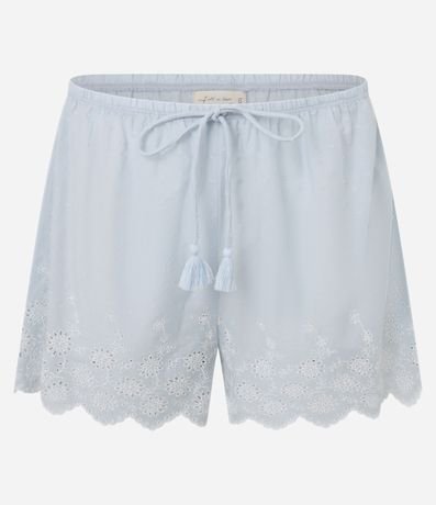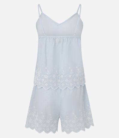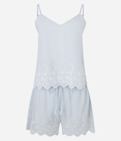 Ref: Conjunto de pijama fresquinho confeccionado em algodão BCI. São duas peças: blusa com alcinhas reguláveis e decote V; e short com cintura elástica e tassel. Ambas são lisas e têm barrado com bordado estilo laise.