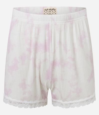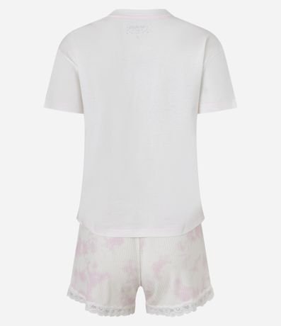 Conjunto de pijama composto por duas peças: camiseta de algodão com mangas curtas e estampa de gatinho pleno; e short de viscose com cintura elástica e rendinha na barra.