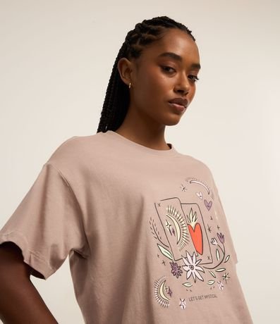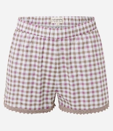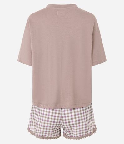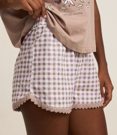 Ref: Conjunto de pijama de algodão composto por duas peças: camiseta ampla com mangas curtas e estampa frontal mística; e short com cintura elástica, rendinha na barra e estampa xadrez vichy.